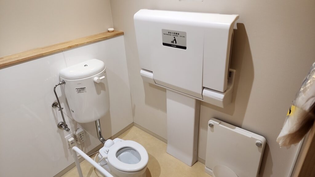 従来通りお部屋でオムツ交換していただいてもいいですし、親子トイレのシートをご利用いただいても大丈夫です。
